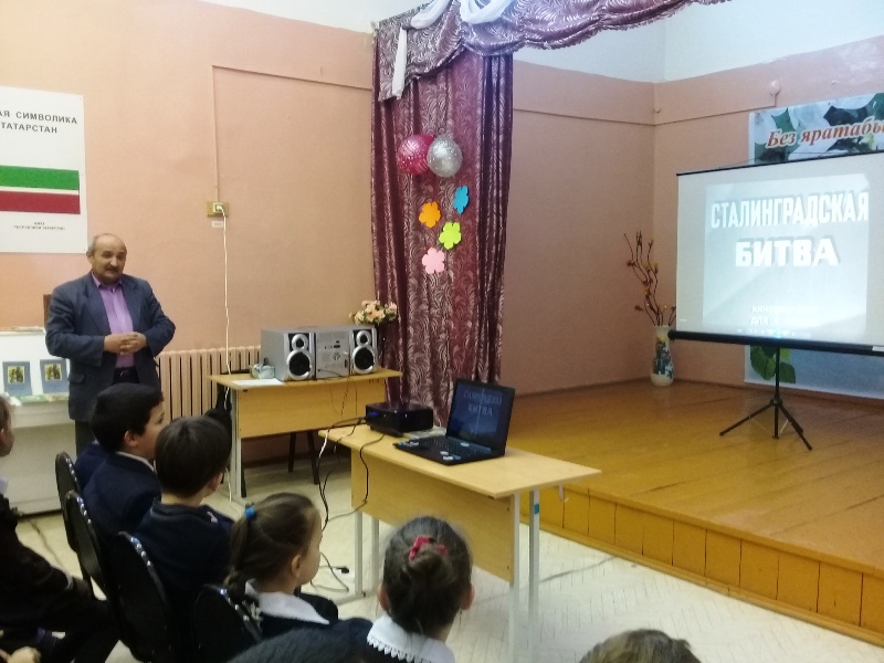 Наряду с этим, 2 февраля – это день разгрома советскими войсками немецко-фашистских войск в Сталинградской битве. О событиях Сталинградской битвы детям рассказал учитель истории Псеевской СОШ Тимербаев Н.Ш. – автор 3 книг «Батыр авылдашларым». Слова его были дополнены показом фильма «Сталинградская битва».