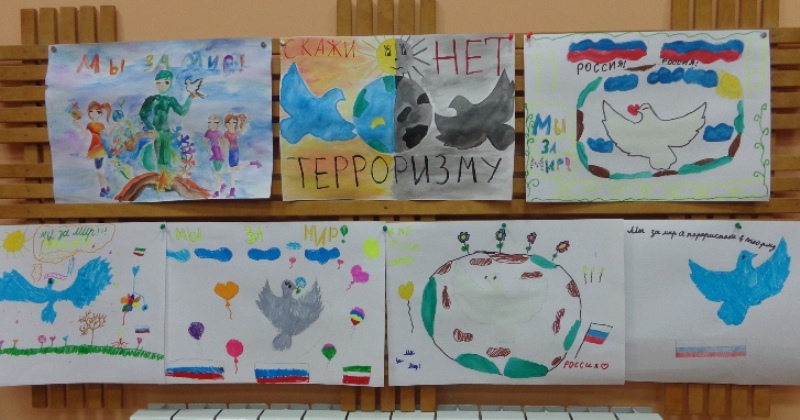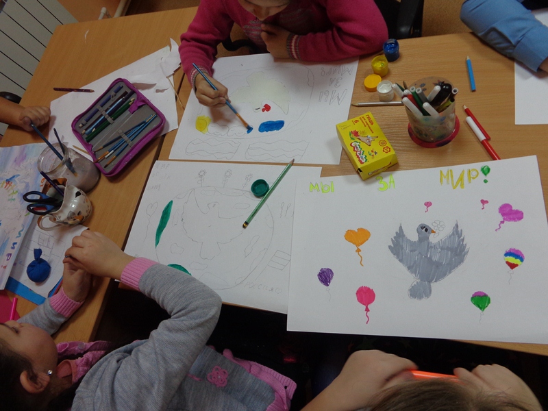 Затем состоялся конкурс рисунков, на тему «Мы за мир!». А директор Н.Бакаева раздала всем присутствующим символ мира – бумажных голубей.