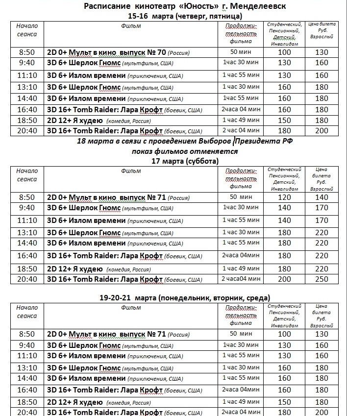 Расписание фильмов с 15 по 21 марта