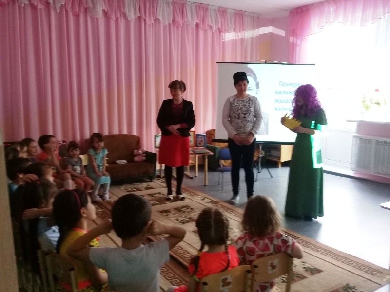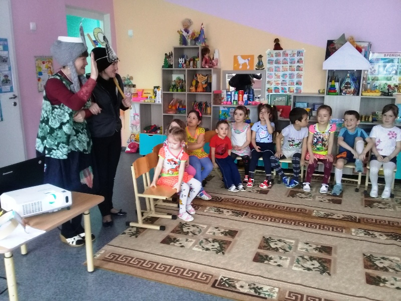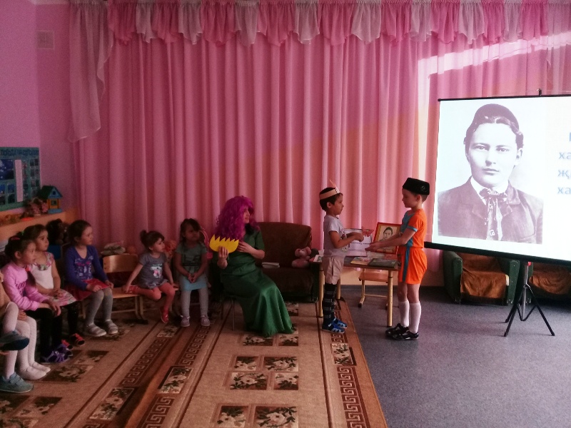 Была оформлена книжная выставка «Тукай – милләтебез кояшы». Пока воспитательница детского сада Хасанянова Гулия знакомила детишек с жизнью и творчеством великого поэта Г.Тукая, в гости на праздник к детишкам забрели герои сказки «Су анасы» - Водяная ( Яраханова Рузалия) и мальчик (Шаяхметова Ляйсан), который украл ее золотой гребень. В честь праздника, она не стала его сильно ругать, а сказала, что чужие вещи без спроса брать нельзя. Поиграв с детишками в игру «Ачык авыз» и, послушав стихи детей, она попрощалась с детьми. Затем пришли герои сказки «Кәҗә белән Сарык әкияте» Баран (Яраханова Рузалия) с Козой (Хасанянова Гулия). Они предложили детишкам поиграть в игру «Собери пазл», отгадать загадки из волшебного мешочка. В конце мероприятия все вместе потанцевали и посмотрели мульфильмы «Шурале», «Су анасы», «Кәҗә белән Сарык әкияте», «Гали белән Кәҗә». Детишкам мероприятие очень понравилось.
