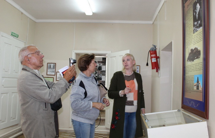 Бывшего химика кроме данного направления также интересует история. Он про Менделеевск узнал из интернета и решил заехать в наш городок. Автотурист посетил краеведческий музей, где ему научный сотрудник Ольга Боднарь при помощи переводчика Ольги Александровны Маштаковой провела экскурсию. Гость интересовался всем.