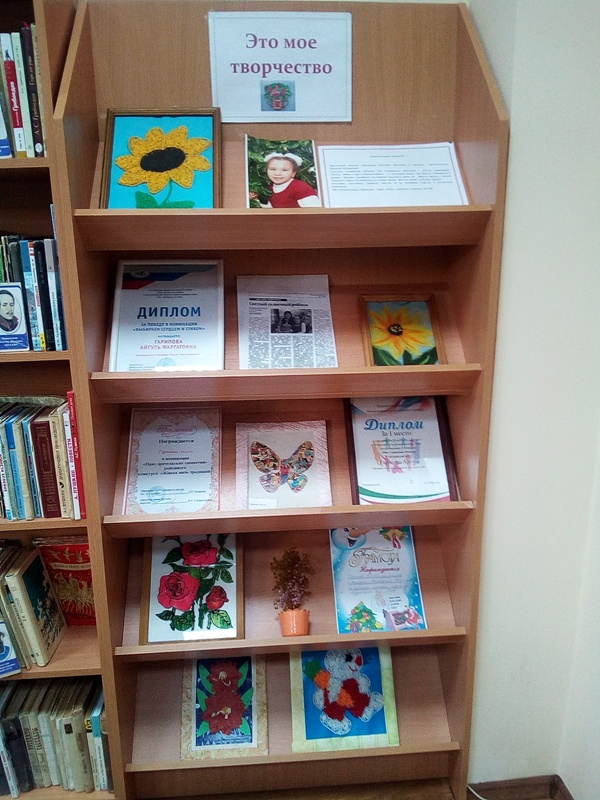 С 3 декабря в Детской библиотеке работают выставки персонального творчества двух девочек Закусиловой Ани и Гарипова Айгуль, которые являются читателями Детской библиотеки.
