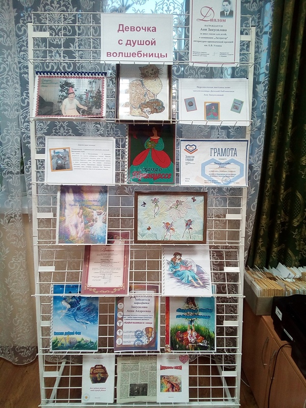 Выставка «Девочка с душой волшебницы». Это выставка с книгами и поделками Закусиловой Ани. За свои работы она получила призовые места в конкурсах. Про Аню и о посещение семьи Закусиловых в приют «Камские зори» было напечатана статья в еженедельнике «Моя газета».