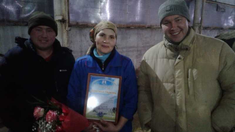 15 декабря 2018 года специалисты УСХиП совместно с главой КФХ Аглиевым Динаром Раисовичем провели контрольную дойку в данном хозяйстве, а также наградили Почетной грамотой Управления сельского хозяйства и продовольствия района Замятину Наталью Фёдоровну – оператора машинного доения КФХ Аглиев Д.Р. за наивысший надой молока среди доярок района в количестве 29200 кг по итогам работы за ноябрь месяц 2018 года.