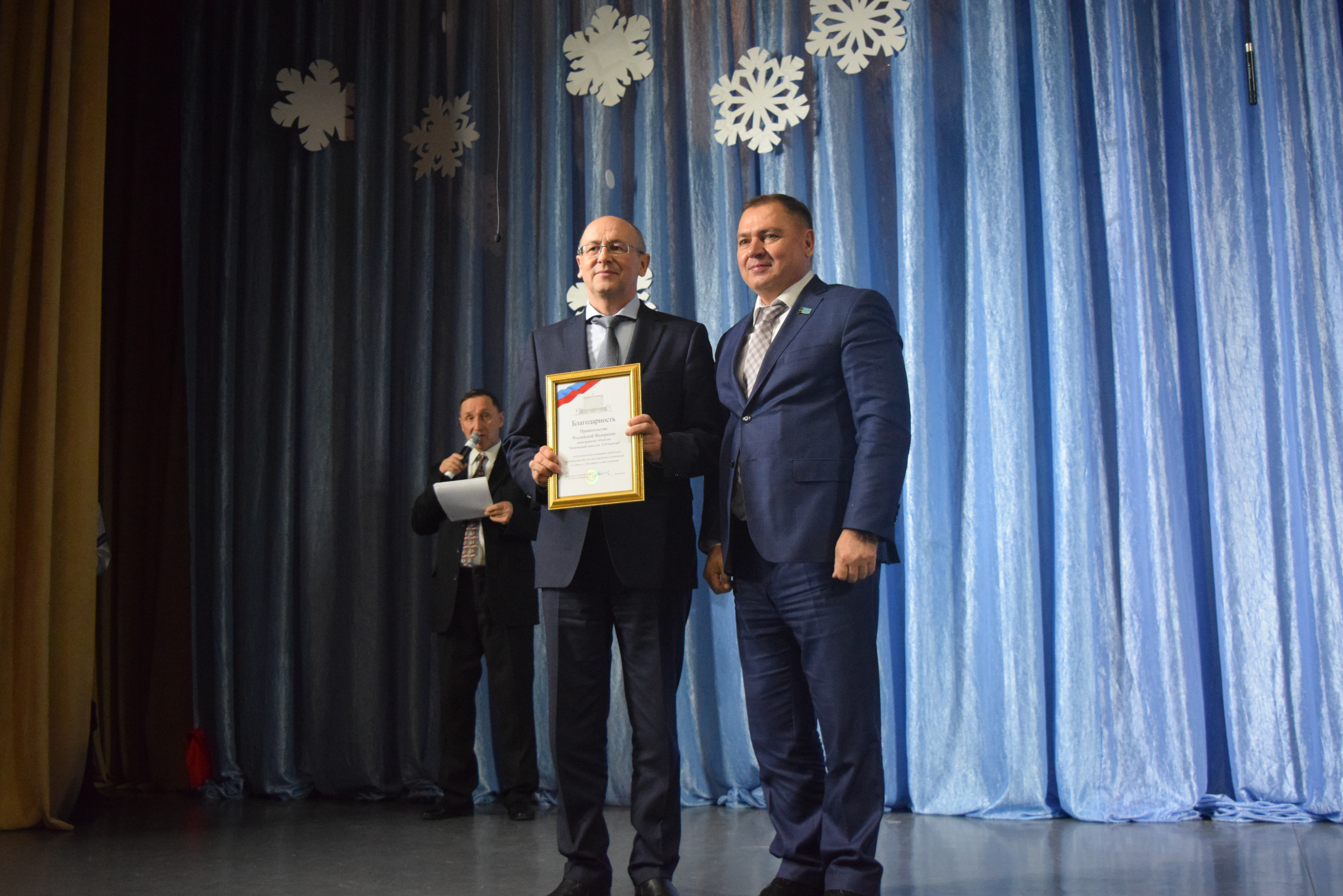 1. Благодарность Правительства Российской Федерации за большой вклад в развитие химической промышленности, высокие трудовые достижения и в связи со 150-летием со дня образования акционерному обществу «Химический завод им.Л.Я. Карпова», награду получает директор завода Шамсин Дамир Рафисович;