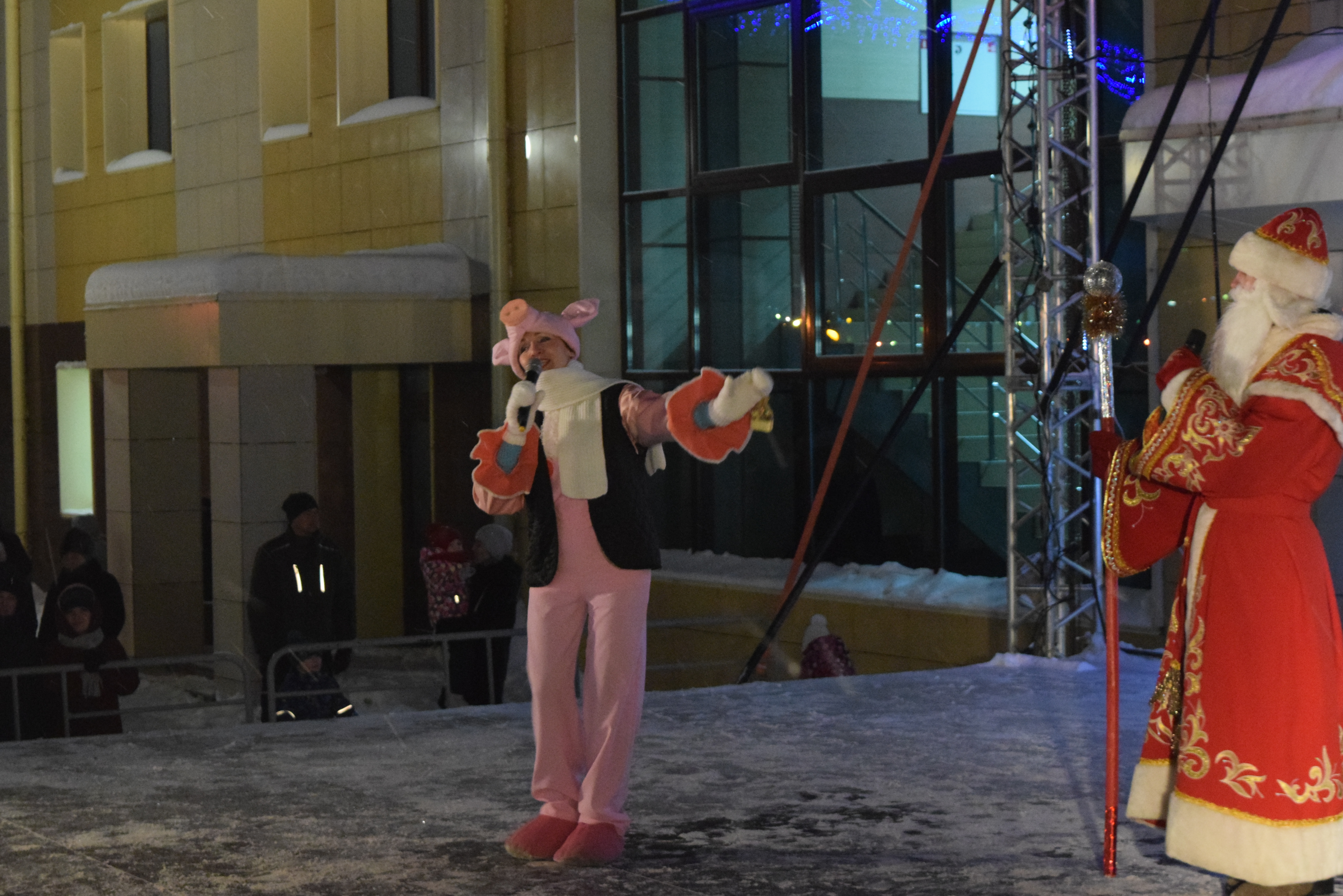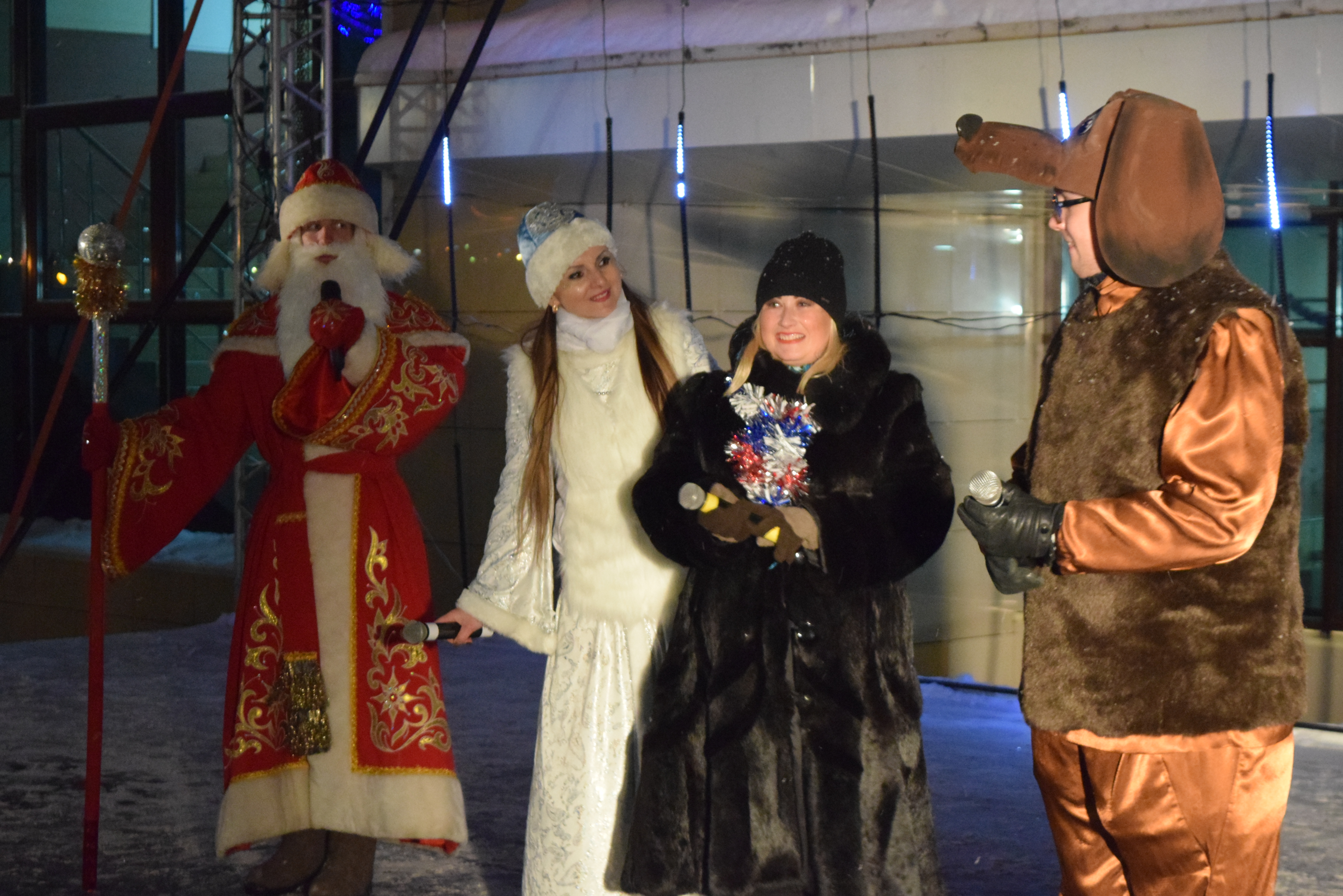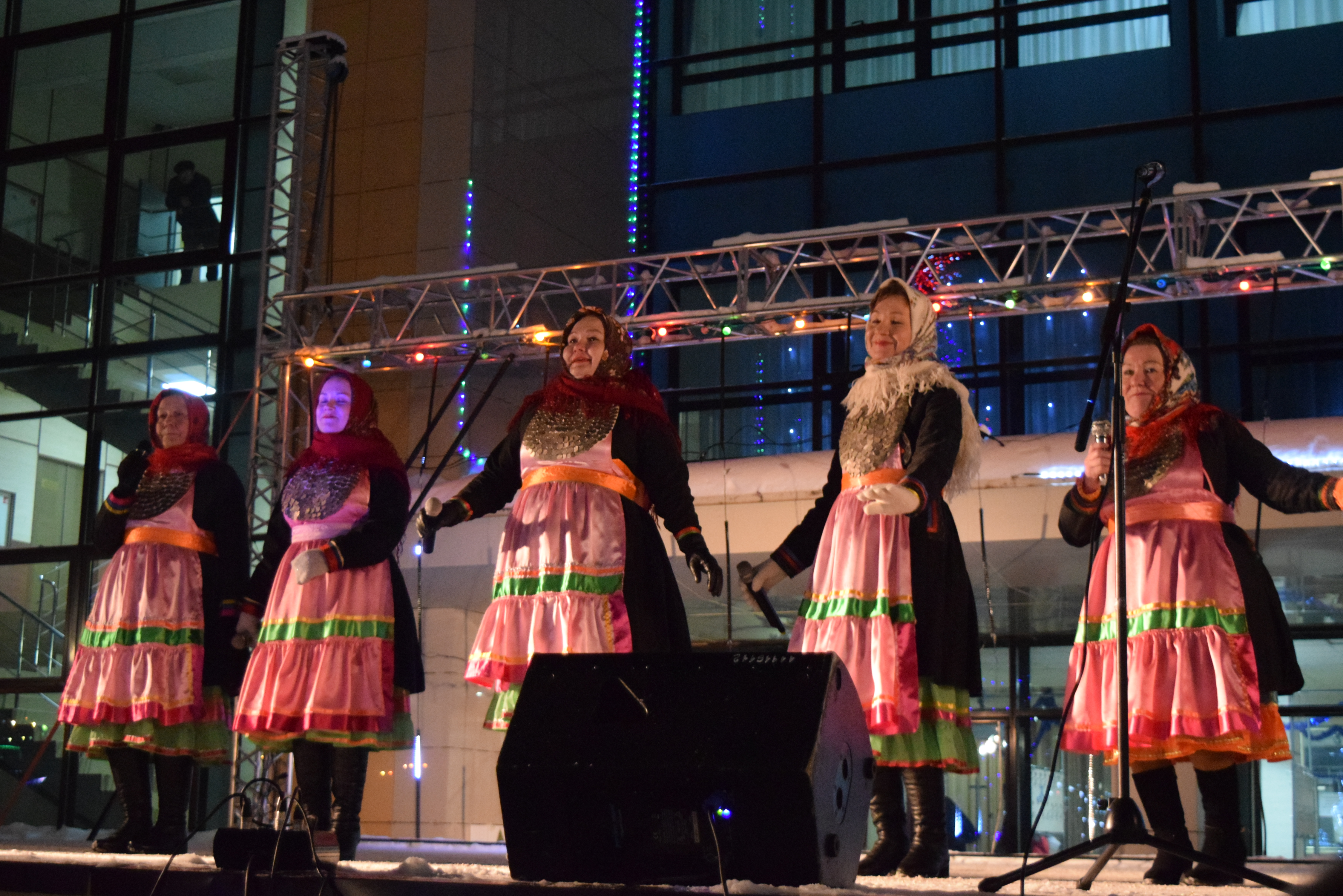 У центральной елки собрались все те, кто в столь поздний час не хотел оставаться дома. Праздничные мероприятия начались с театрализованного представления. Для местных жителей выступили музыкальные и танцевальные ансамбли, настроение поднимали сказочные персонажи.