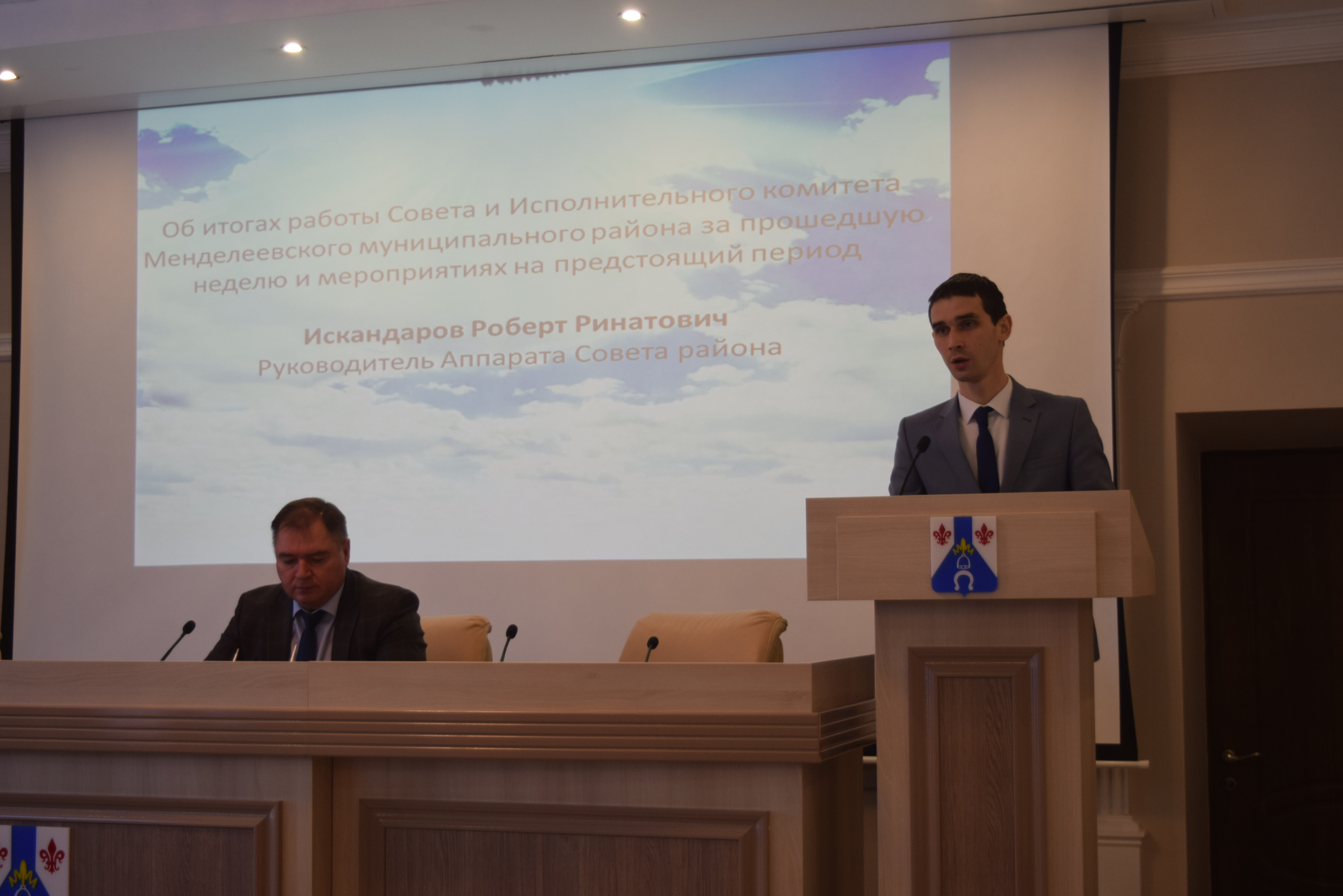Об итогах работы Совета и Исполнительного комитета Менделеевского муниципального района за прошедшую неделю и мероприятиях на предстоящий период рассказал Искандаров Роберт Ринатович – руководитель Аппарата Совета района.