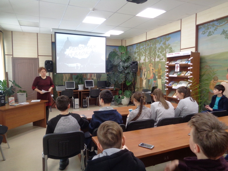Героизму жителей осаждённого Ленинграда в годы войны посвящён историко-поэтический час «Репортаж из блокады», который подготовили и провели 30 января сотрудники Центральной библиотеки для учащихся 7-х классов школы №3.