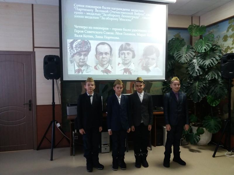 Детская библиотека подготовила для своих читателей интересный военно-патриотический экскурс в историю «В книжной памяти мгновения войны», которую открыла рассказом о роли партизан в борьбе против фашистских захватчиков. О мужестве и героизме детей – партизан. Присутствующие посмотрели документальный ролик об учреждении медали «Партизану Отечественной войны». После вводной беседы детям были прочитаны книги А. Митяева «Подвиг солдата», А. Печерской «Пионеры- герои», Н. Надеждиной «Партизанка Лара». После трогательной беседы, ребята почтили память павших детей – партизан минутой молчания. Всего в мероприятиях акции, организованной Детской библиотекой приняло участие 143 человек из 1 «В» ( кл рук Мухамадеева Т.В), 1 «Г» (кл рук Бузаджи Г.Н.), 4 «Д» (кл. рук. Прохорова Н.Р.), 4 «Г» (кл. рук. Насифуллина Ф.М.) МБОУ «СОШ№1» и 5 «Б» (кл. рук. Петрова М.А.) МБОУ «СОШ №3». Учащиеся 5 класса подготовились к встрече, они рассказали стихи о партизанах. Библиотекари работали на трех площадках: абонемент - библиотекарь Сырышева Т.Н.; читальный зал библиотеки и школа – библиотекари – Зеленцова А.В, Назарова Е.А/