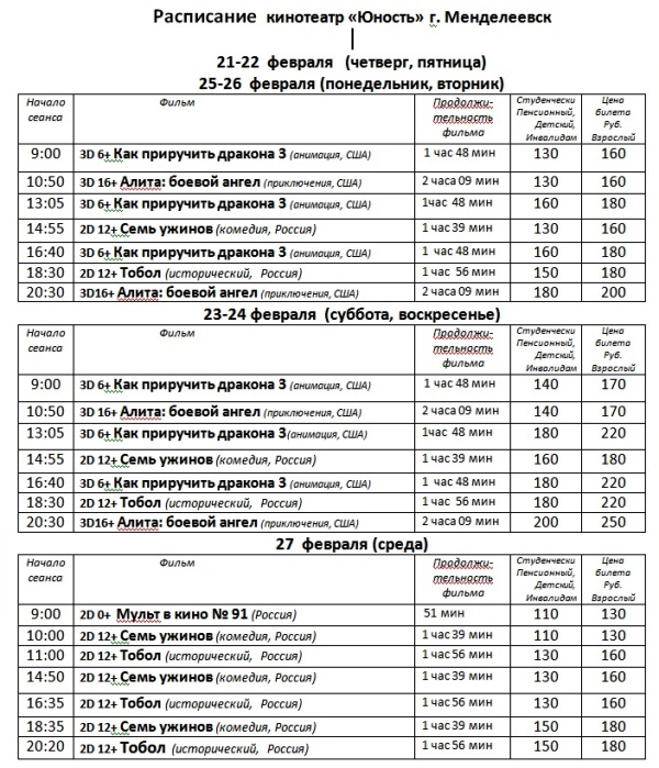 Расписание кинофильмов в кинотеатре «Юность» с 21  по 27 февраля