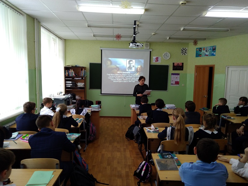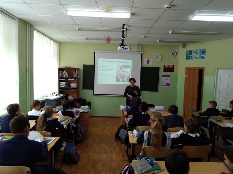 Фируза Габдрахманова рассказала об интересных фактах из жизни поэта, его непростых детских и юношеских годах, литературной деятельности. Учащиеся узнали о подвиге поэта-героя и об обессмертившей его имя автобиографичной книге стихов «Моабитская тетрадь», за которую Муса Джалиль был удостоен Ленинской премии.В завершение урока учащиеся почтили память поэта минутой молчания.