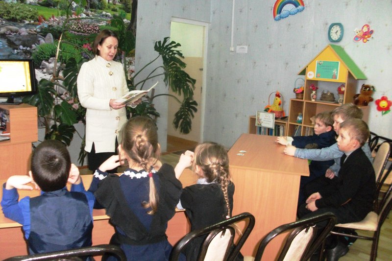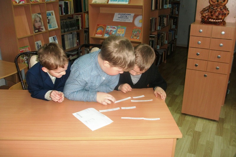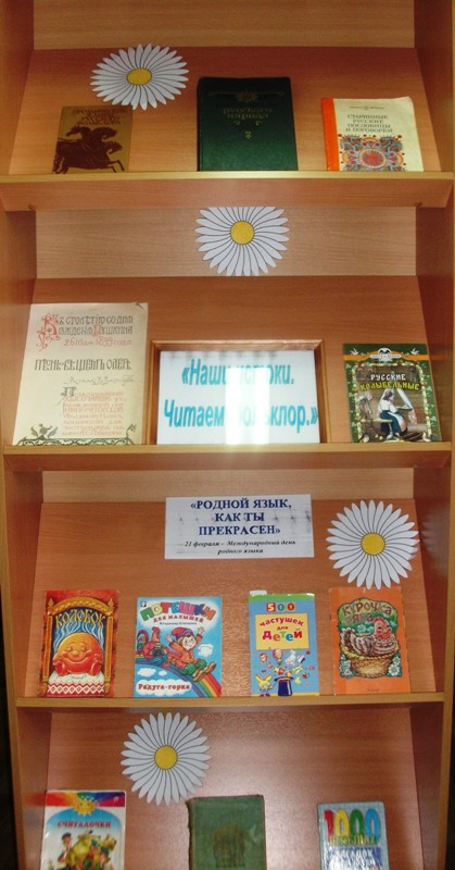 После уроков к акции присоединились учащиеся начальной школы. Для них была проведена игра – викторина «В гости к дедушке Фольклора». Ребята разделились на две команды. Листая слайды презентации, дети знакомились с новыми считалками, потешками, дразнилками, небылицами, скороговорками, частушками, колыбельными. Отвечали на вопросы по русскому народному творчеству. Все вмести, с удовольствием спели веселые частушки, а упражнялись в декламировании скороговорок. Все без исключения знали различные считалочки. Ребята должны были отгадать концовку русских пословиц и поговорок. В конце мероприятия был сделан важный вывод о ценности прошлого, потому что если человек интересуется фольклором, значит, интересуется своей историей. В библиотеке к мероприятию была представлена книжная выставка «Родной язык, как ты прекрасен», на которой представлены книги русского фольклора – считалочки, детские загадки, скороговорки пословицы, сказки.