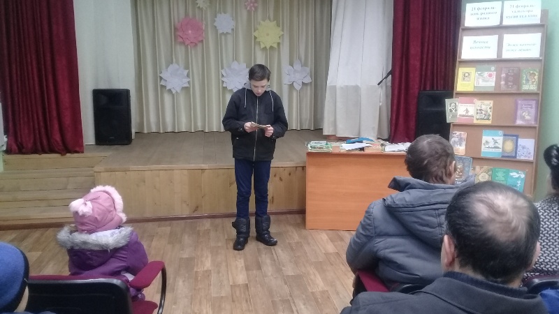 Ведущие рассказали о важности этого праздника, о проблемах сохранения языков малых народов на татарском и русском языках. После этого вечер продолжился чтением сказок. В ходе праздника вспомнили народные песни, колыбельные, пословицы, поговорки, фразеологизмы, разгадывали загадки. Присутствующие говорили друг другу слова приветствия на трёх языках. Очень понравилась зрителям удмуртская народная песня в исполнении Башениной Екатерины.