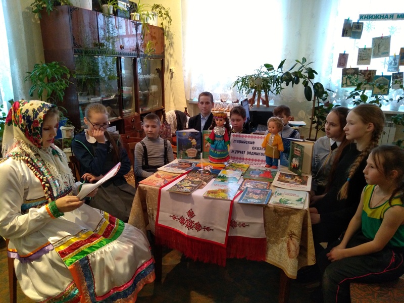Цель акции-популяризация национального фольклора среди подрастающего поколения. Сплочённые любовью к животворящему роднику мудрого народного слова, дети смогут познакомиться с произведениями национального фольклора на родном языке. Народ мари создал уникальную неповторимую культуру, к которой мы предлагаем прикоснуться, познакомившись с марийскими народными сказками. В рамках акции прошел фольклорный час «Язык –живая душа народа» (Йылме – калыкын чонжо). Ребята пришли в библиотеку окунуться в мир фольклора народных марийских сказок. Участники мероприятия активно отгадывали загадки на марийском языке, прослушали отрывок сказки «Сереброзубая Пампалче». Большой интерес вызвала книжная выставка «Марийские сказки журчат родником», где представлены сказки на марийском языке, книги о культуре марийского народа, об их обычаях и обрядах.