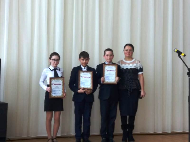 Начальник управления культуры Е.В. Шигапова отметила дипломами Алексееву Викторию МБОУ «Ижевская СОШ», Сайранову Эльвину МБОУ «СОШ№1», Семякова Кристиана МБОУ «СОШ№1», Суханова Вадима МБОУ «Ильнетская ООШ»