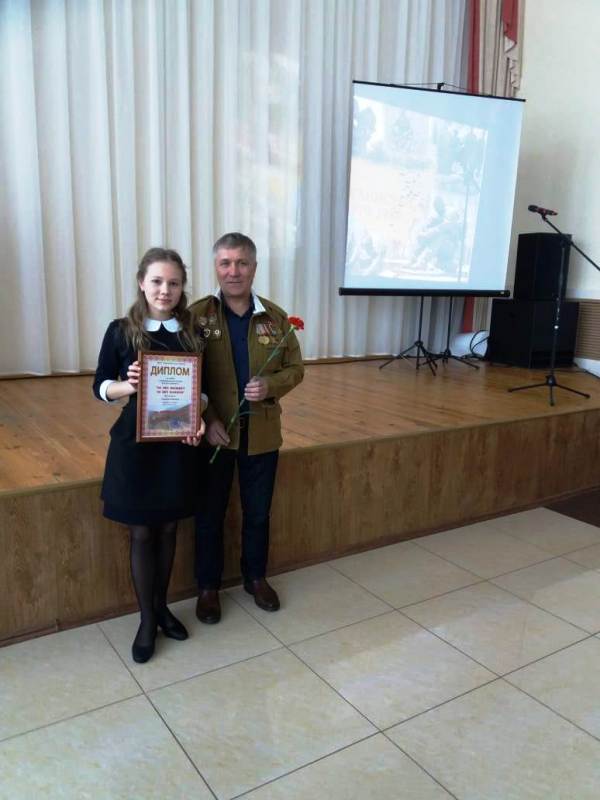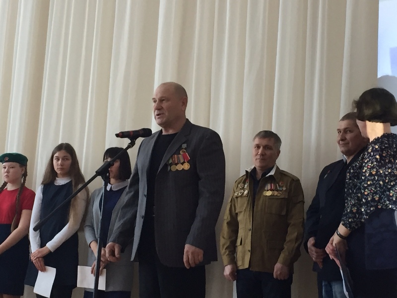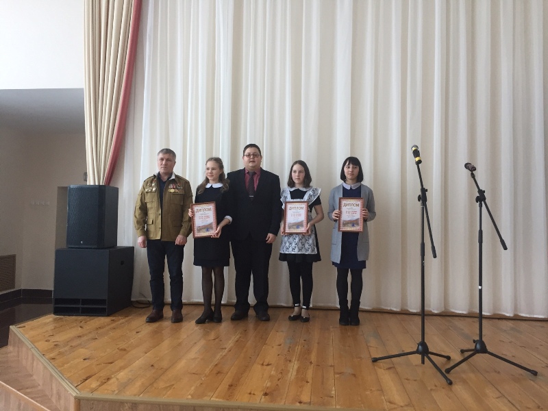 Военный комиссар Менделевского района РТ, участник боевых действий в Афганистане Залуженко С.В. наградил грамотой Куликову Ольгу МБОУ «Гимназия №1», Мальгину Анастасию МБОУ «Старо-Гришкинская СОШ», Харитонову Лию МБОУ «СОШ №1», Саидову Амину МБОУ «Гимназия №1», Хузину Алию МБОУ «Псеевская СОШ», Абрамову Марию МБОУ «СОШ №1». Грамота за активную работу по патриотическому воспитанию была вручена Детской библиотеке.