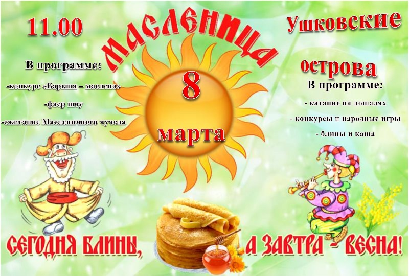8 марта в 11.00 часов в парке “Ушковские острова” состоится Масленица. В программе: