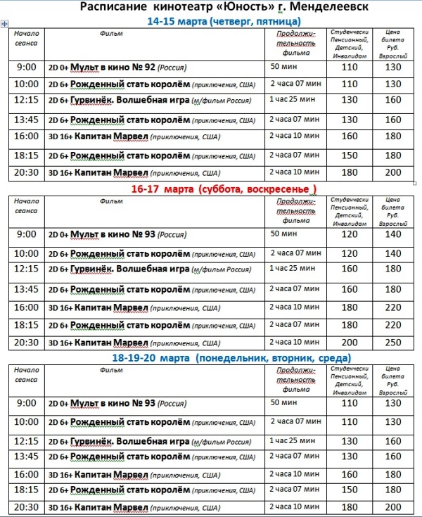 Расписание кинофильмов в кинотеатре «Юность» с 14 по 20 марта