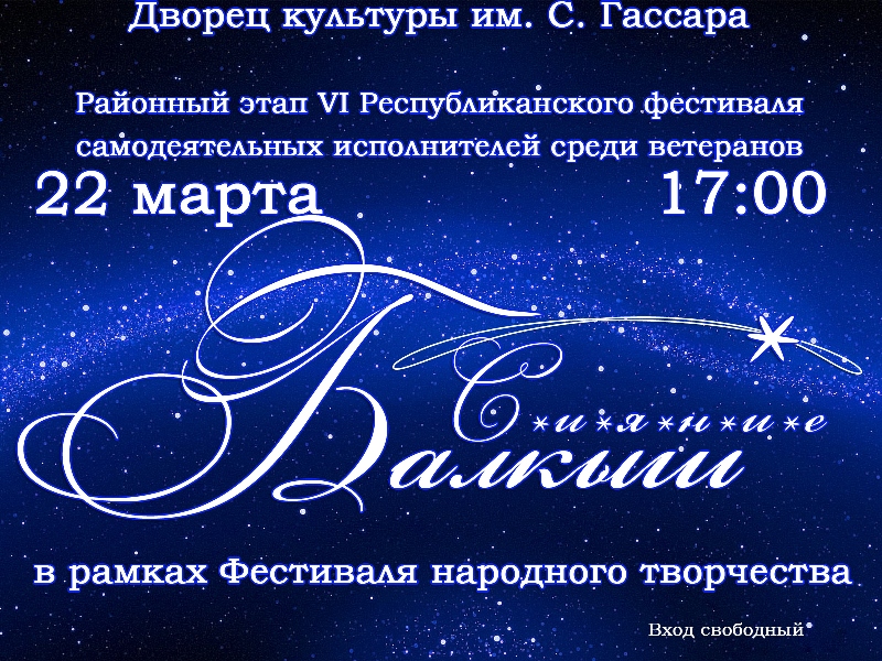 22 марта в 17.00 часов в рамках фестиваля народного творчества во Дворце Культуры им. С.Гассара состоится районный этап VI Республиканского фестиваля самодеятельных исполнителей среди ветеранов «Балкыш-Сияние».