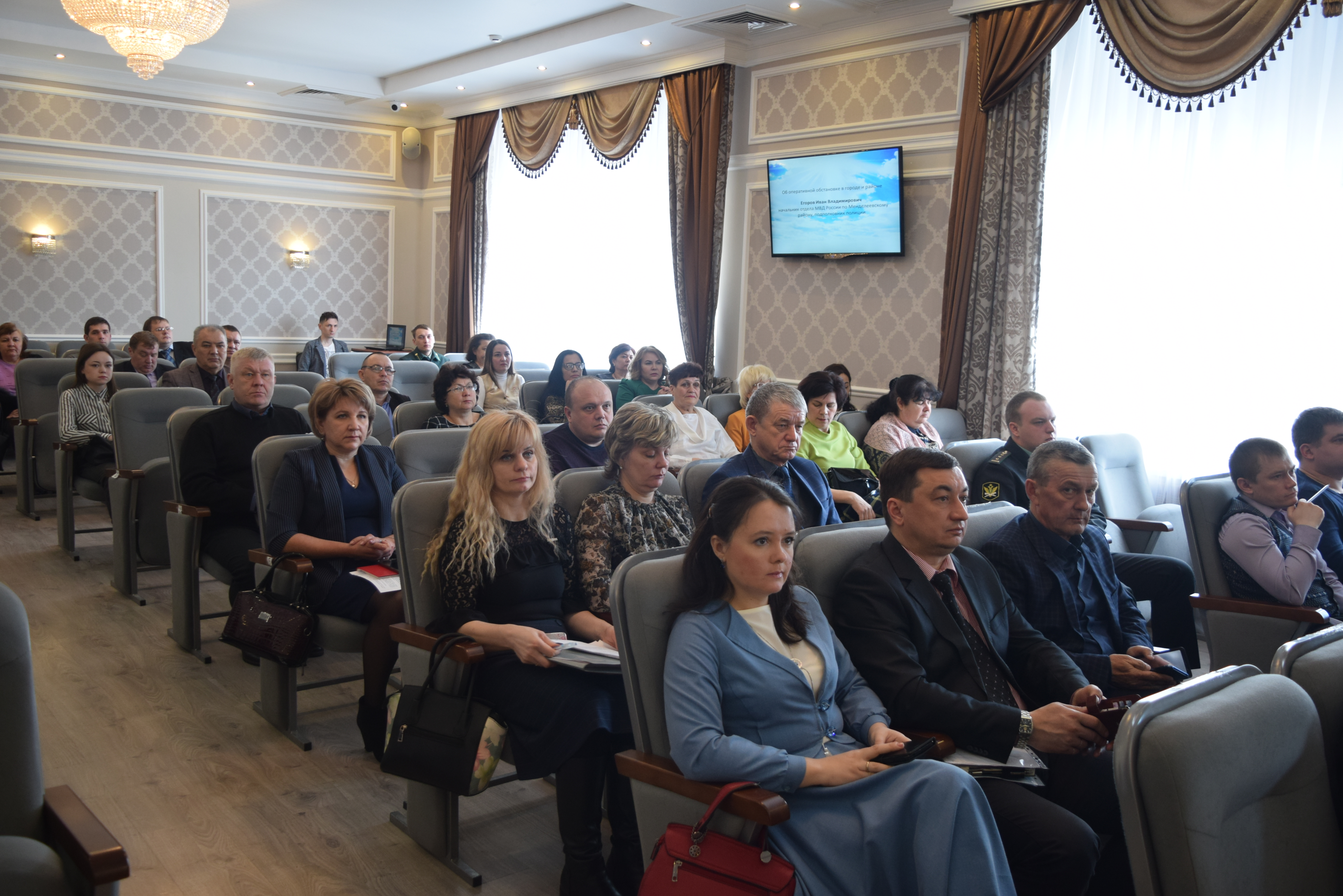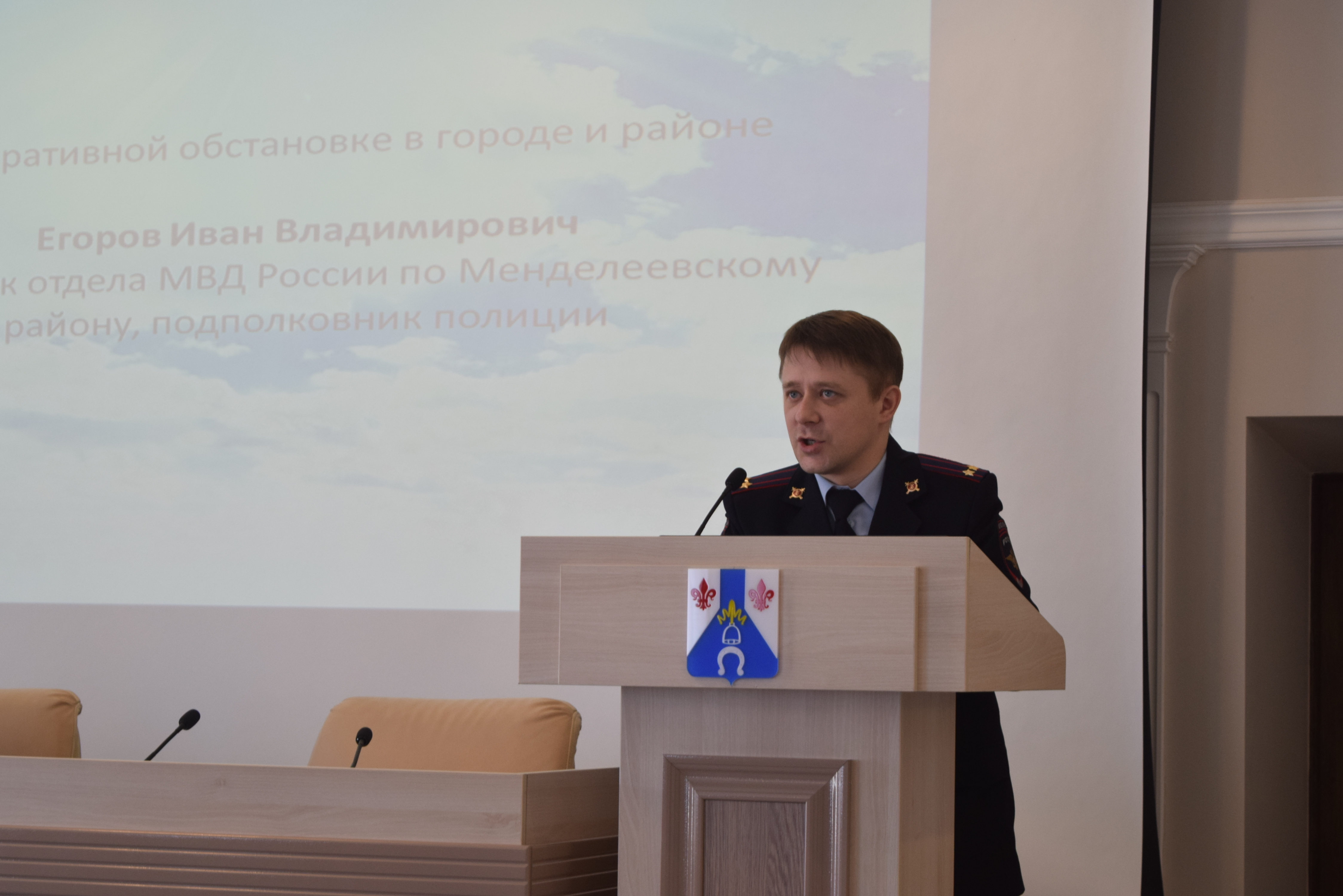 Далее, об оперативной обстановке в городе и районе доложил Егоров Иван Владимирович – начальник отдела МВД России по Менделеевскому району, подполковник полиции.