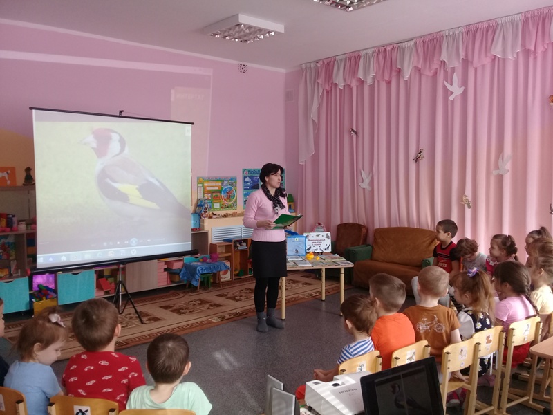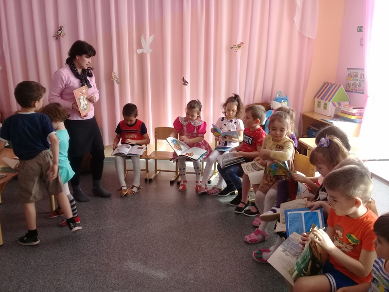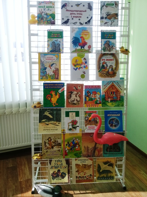 Вначале мероприятия ребятишкам было предложено прослушать голоса птиц и отгадывать их по картинкам на слайдах. С этим заданием они справились очень хорошо. Узнали, что птицы бывают зимующие и перелетные; что они являются помощниками и защитниками лесов, полей, огородов. А их веселые трели оживляют природу, доставляют нам радость. А как много написано книг о птицах. Библиотекарь обратила внимание ребятишек на выставку книг «1 апреля – Международный день птиц», которую они с интересом потом рассматривали. С воспитательницей Хасаняновой Г. поиграли в подвижную игру «Летит – не летит», в которой они с удовольствием участвовали. В конце мероприятия все вместе посмотрели мультфильмы про пернатых друзей «Мактанчык чыпчык», «Кукушка и скворец», «Гадкий утенок».