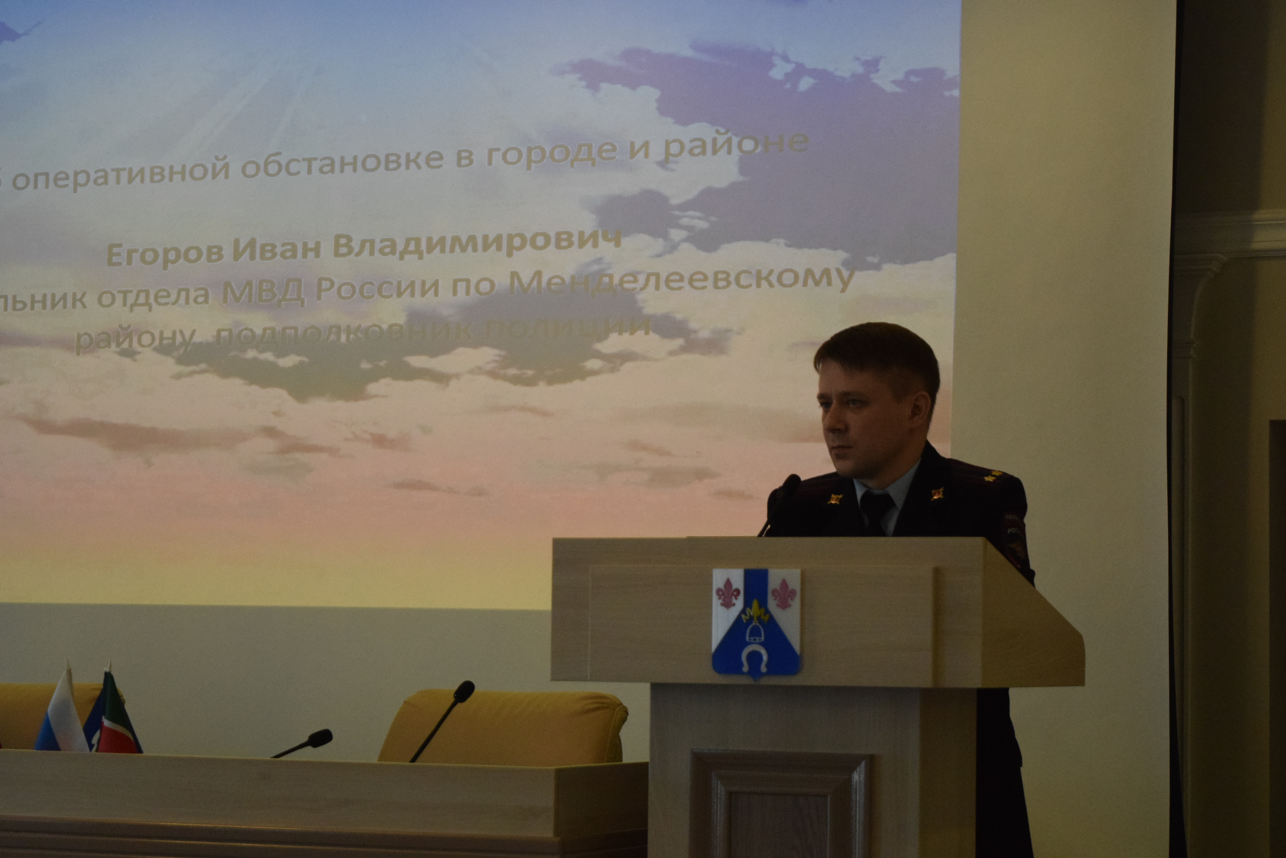 Далее, об оперативной обстановке в городе и районе доложил Егоров Иван Владимирович – начальник отдела МВД России по Менделеевскому району, подполковник полиции.