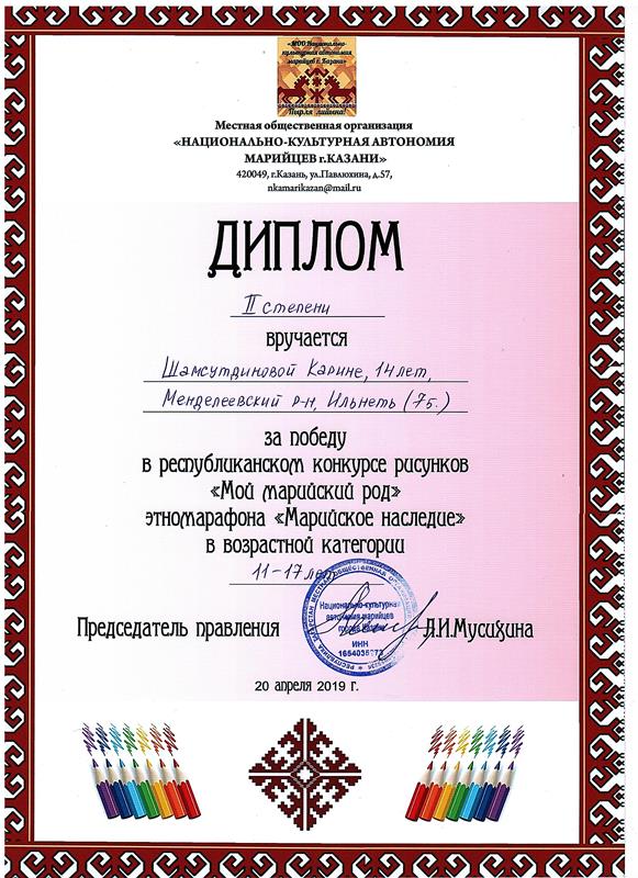 В рамках реализации этого проекта был обьявлен конкурс детских рисунков "Мой марийский род". В этом конкурсе приняли участие и школьники СОШ им.Микая села Ильнеть. В возрастной категории 11-14 лет учащаяся Ильнетской СОШ Шамсутдинова Карина завоевала 2 место, набрав 7 баллов.