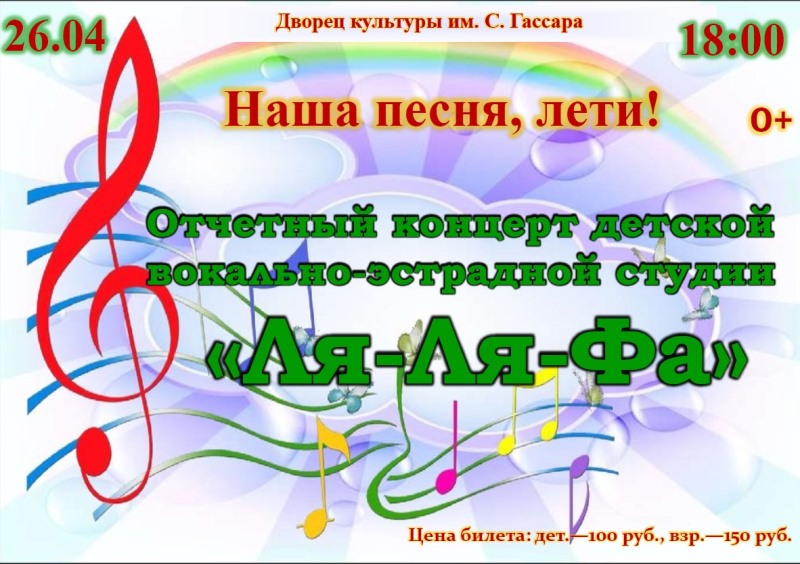 26 апреля в 18.00 часов ДК им.С.Гассара приглашает на отчетный концерт “Наша песня, лети!” детской вокальной эстрадной студии “Ля-Ля-Фа”.