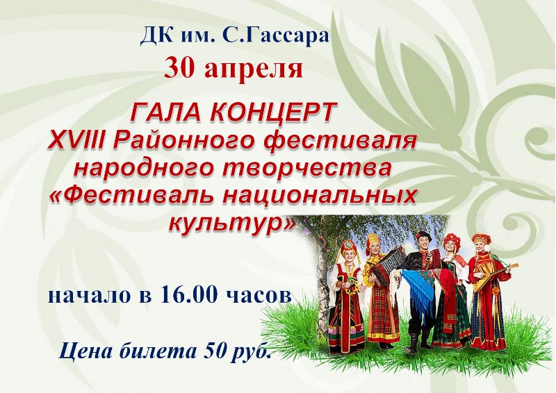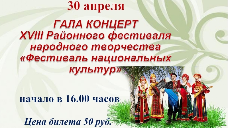 30 апреля состоится ГАЛА КОНЦЕРТ XVIII Районного фестиваля народного творчества «Фестиваль национальных культур»