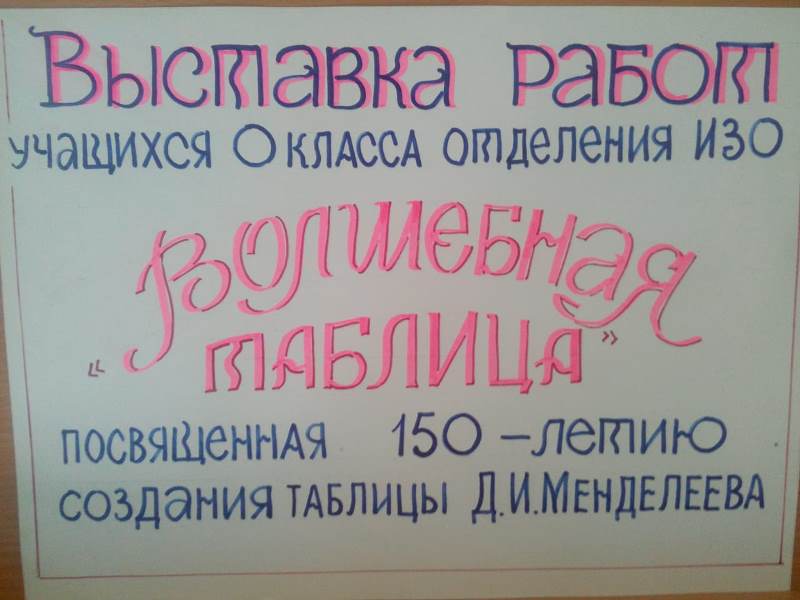 В фойе Детской школы искусств открылась выставка учащихся подготовительного класса, посвященная 150-летию создания таблицы Д. И. Менделеева. Выставка называется «Волшебная таблица». Юные художники «оживили» таблицу и нашли интересные образы различным химическим элементам. Выставка получилась яркой и радостной. Она продлится 2 недели.