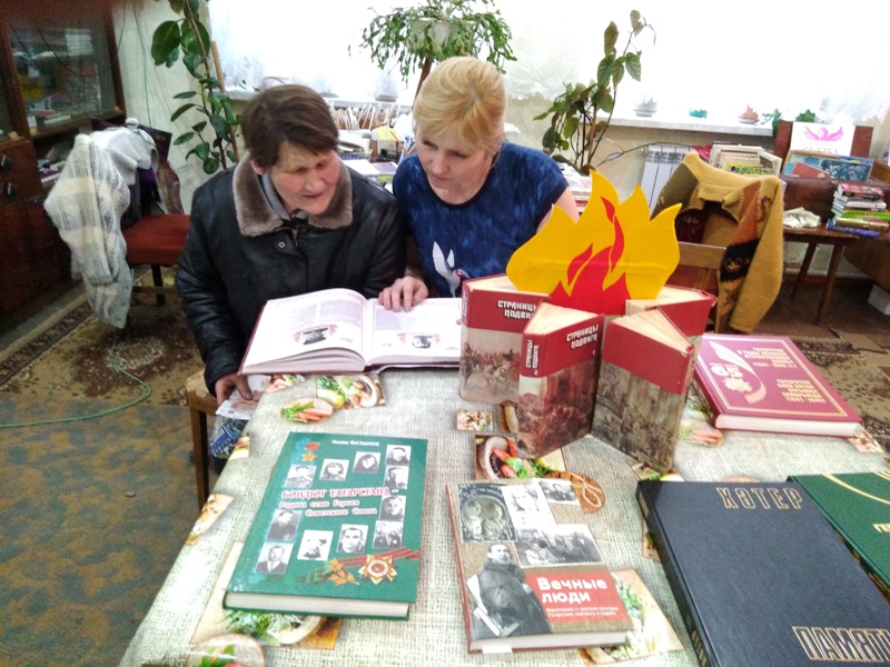 Библиотекарь напомнила, что мы собрались вместе, чтобы еще раз вспомнить о тех событиях военных лет, и о тех людях, которые завоевали для нас мир на земле. В годы Великой Отечественной войны многие наши земляки получили боевые награды. Рассказала о подвигах сельчан, познакомились с книгами.