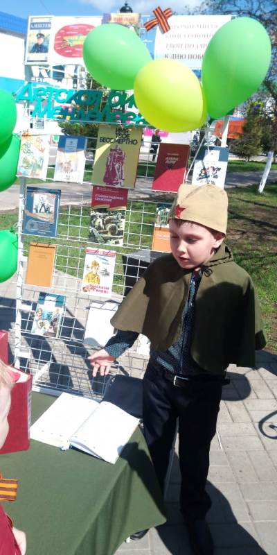 Детская библиотека продолжила Международную акцию «Читаем детям о войне», организатором которой стала Самарская областная детская библиотека. Ее главная цель – воспитание гражданственности и патриотизма у детей и подростков на примере лучших образцов детской литературы о Великой Отечественной войне 1941-1945 гг. В этот праздничный день сотрудники детской библиотеки вышли на площадь Ленина с выставкой обращением «Прочитанная книга о войне твой подарок ко дню победы». Конечно, мы не предлагали прочитать всю книгу, а только небольшой отрывок из рассказов. Таким образом, подходившие дети, их родители, бабушки и дедушки прочитали рассказ А.Митяева «Длинное ружье» отрывки из романа В. Катаева «Катакомбы». Многие ребята читали стихи, выученные наизусть, пели песни семьями и по одному. Для прочтения книги была сделана фотозона, где ребята и взрослые надевали военный бушлат и пилотку. Желающих поучаствовать в этой акции было много. На столе лежал альбом «Мы помним», сделанный библиотекарями, куда предлагали записать свое мнение о событиях тех дальних времен, о своих погибших на той страшной войне.