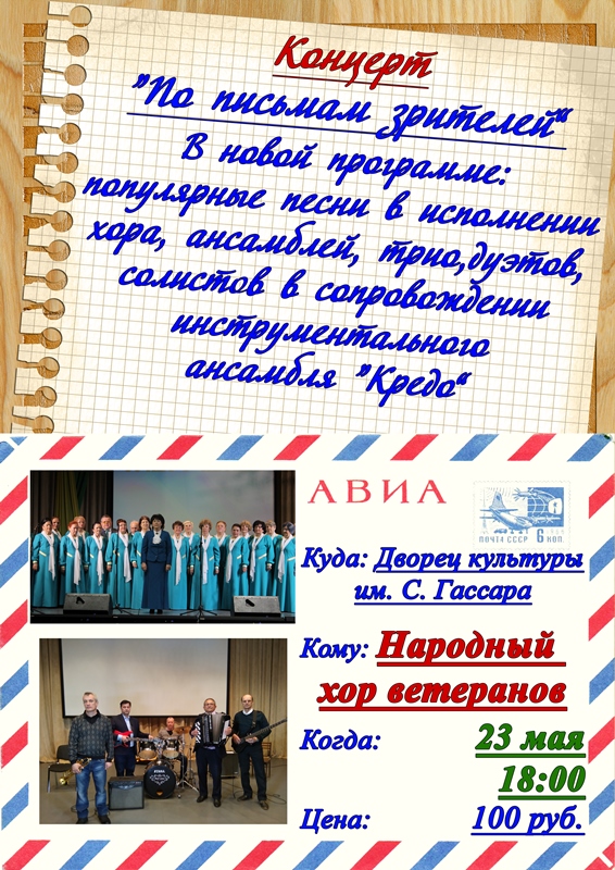 23 мая в 18.00 часов Дворец Культуры им.С.Гассара приглашает на концерт “По письмам зрителей” Народного хора ветеранов. В программе популярные песни в исполнении хора, ансамблей, трио, дуэтов, солистов в сопровождении инструментального ансамбля “Кредо”. Цена билета 100 рублей. Ждем всех желающих.