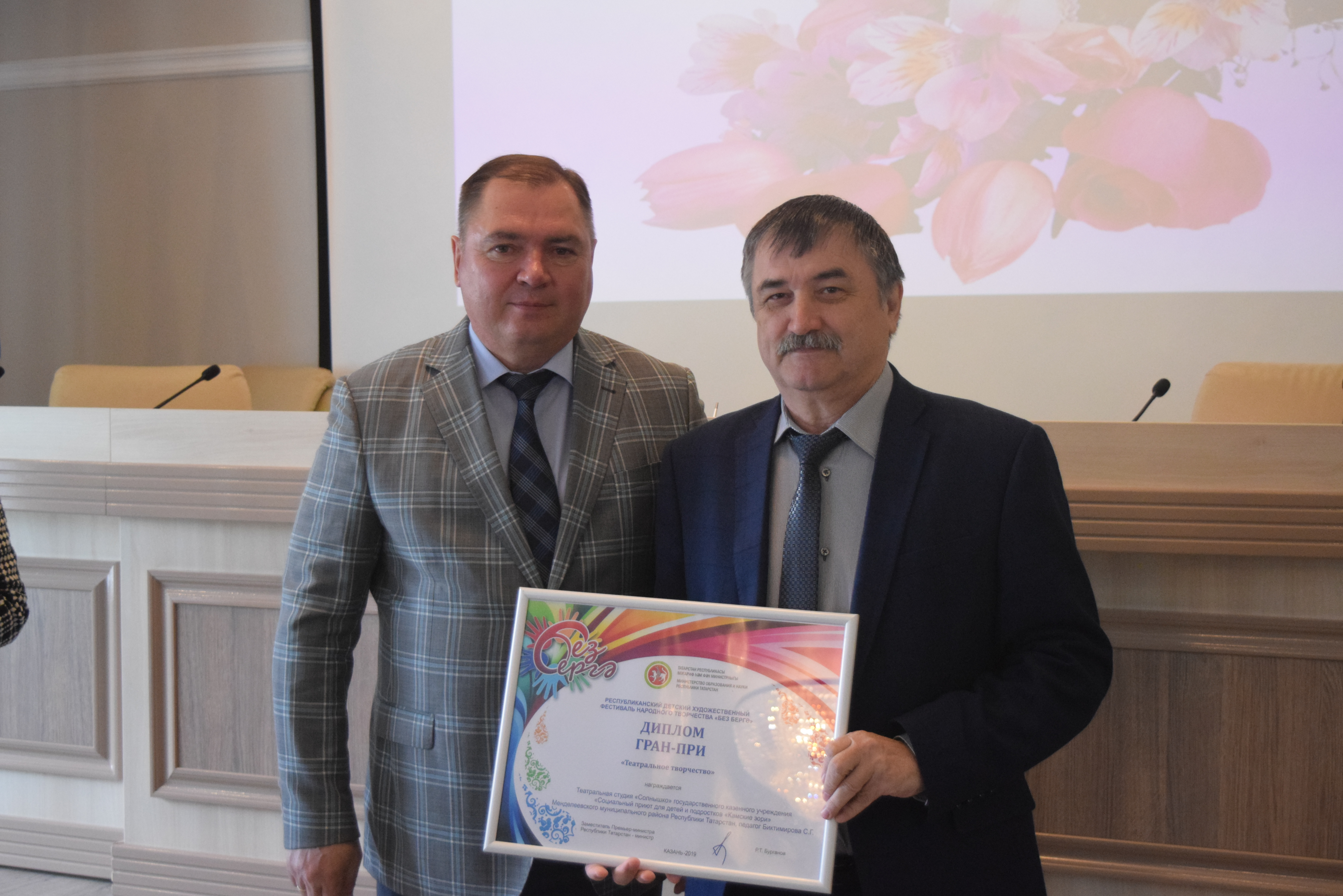 Диплом Гран- При Республиканского детского художественного фестиваля народного творчества «Без Бергэ» в номинации «Театральное творчество» награждается театральная студия «Солнышко» государственного казенного учреждения «Социальный приют для детей и подростков «Камские зори» ММР, награду получает Миронов Павел Степанович – директор приюта «Камские зори»;