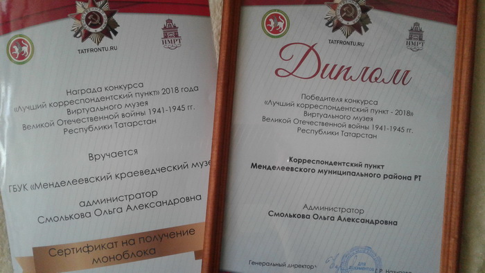 Краеведческий музей г.Менделеевска, на базе которого работает корреспондентский пункт по Менделеевскому району награжден дипломом победителя республиканского конкурса и сертификатом на моноблок. Администратор корпункта О.А.Смолькова.