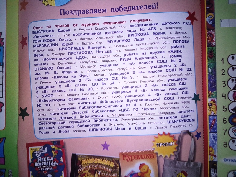 И вот пришел результат. Ура!!! Детская библиотека в числе победителей. Читатели Детской библиотеки получат подарок от знаменитого журнала. Поздравляем журнал «Мурзилка»!!!!! И желаем ему радовать наших читателей еще много, много лет.