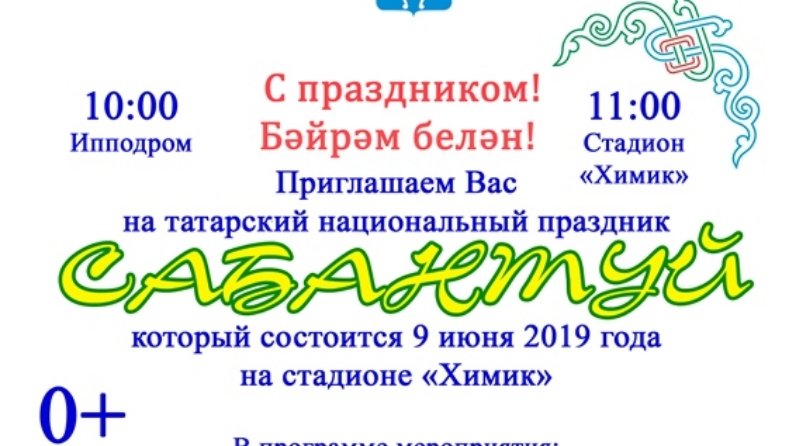 Уважаемые менделеевцы приглашаем Вас на татарский национальный праздник «Сабантуй», который состоится 09 июня 2019 года на стадионе «Химик». В программе мероприятия: чествование батыров весеннего сева, национальная борьба кореш, народные игры, выступление творческих коллективов города и района, спортивные состязания, аттракционы для детей. Начало: