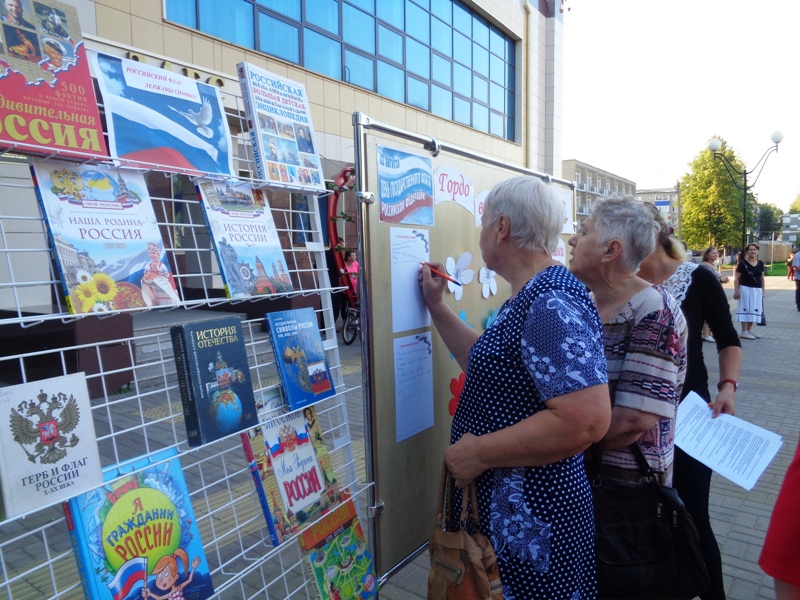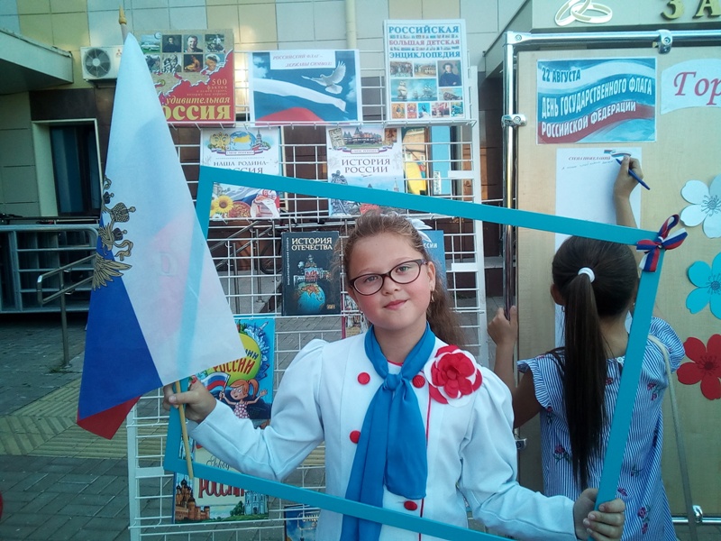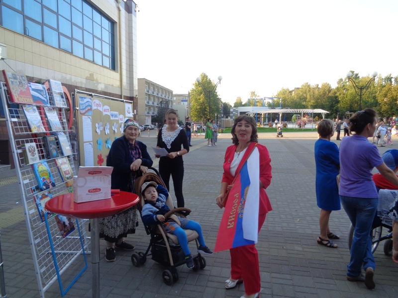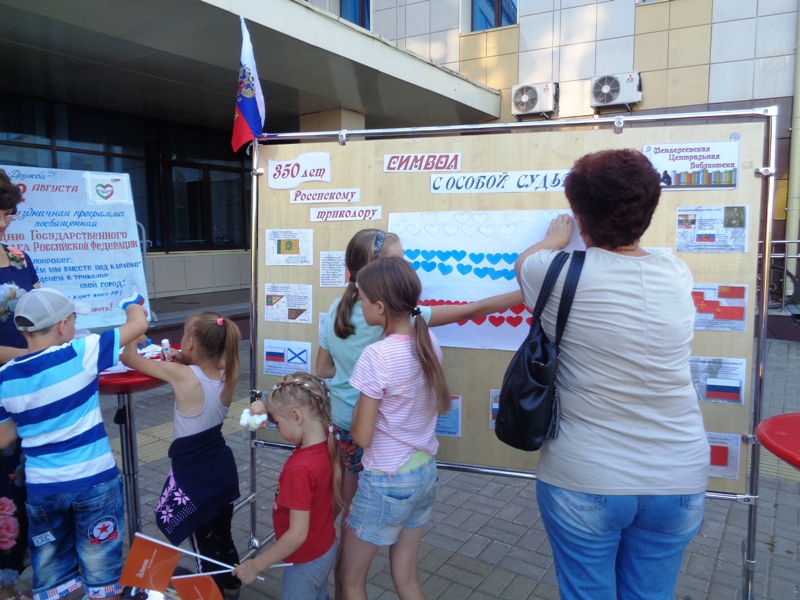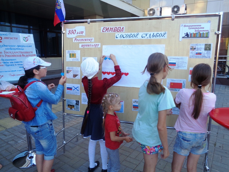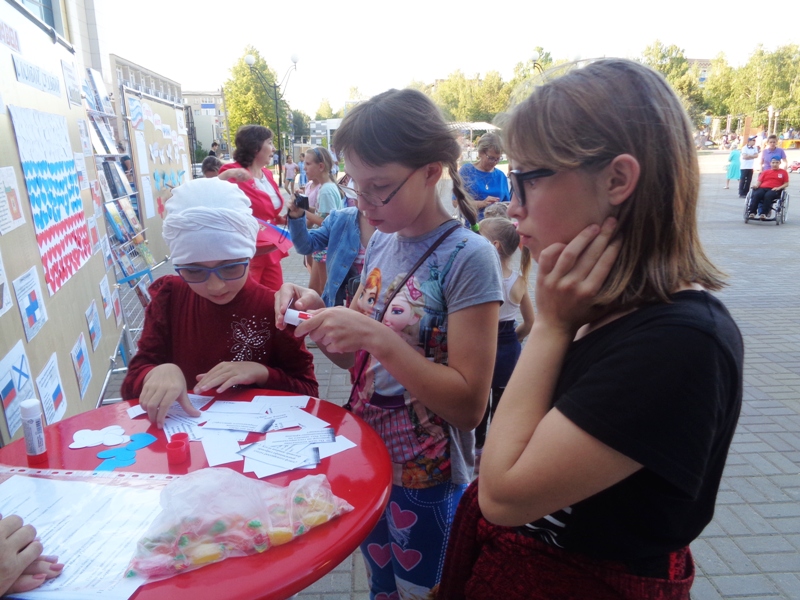 Государственный флаг России является олицетворением ценности нации, верности, честности, мужества и великодушия. Ему отдаются высшие государственные почести. Его достоинство подлежит защите по всему миру, оскорбление флага расценивается как оскорбление чести нации и государства. И не случайно, день 22 августа является национальным праздником – Днем государственного флага Российской Федерации. Детская и Центральная библиотеки организовали творческую площадку для участников праздника, который проходил на площади Менделеева.