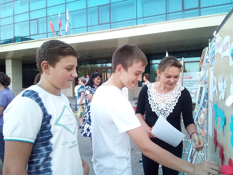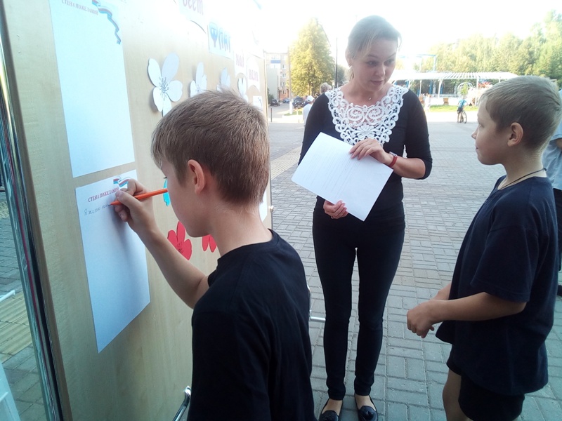 Сотрудники Детской библиотеки предложили интерактивную игру «Гордо веет флаг над нами» для присутствующих. На стенде было предложено выбрать цветок под цвет флага, на котором написан вопрос. Ребята и взрослые отвечали на вопрос и получали маленький подарок. А затем подходили к фотозоне и на фоне выставки «Российский флаг – державы символ» с флагом Российской Федерации делали памятное фото. Оставляли на «Говорящей стене» пожелание городу и горожанам. Вот некоторые записи: «Я желаю, чтобы не было войны!», «Желаю, чтобы Россия была великой страной», «Я желаю чистого неба», «Ваннеса желает счастья! Ура!», «Желаю, чтобы все были здоровы», «Счастья и процветания любимому городу» и др.