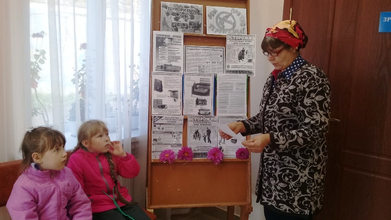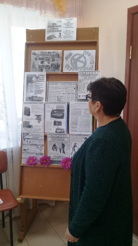3 сентября - День солидарности в борьбе с терроризмом и посетители Тойгузинской библиотеки просмотрели материалы выставки « Терроризм и экстремизм –угроза миру». Библиотекарь раздала детям памятку по безопасности « Если ты дома один» и ещё раз напомнила о мерах безопасности в общественных местах, рассказала о жертвах Беслана и других террористических актах.
