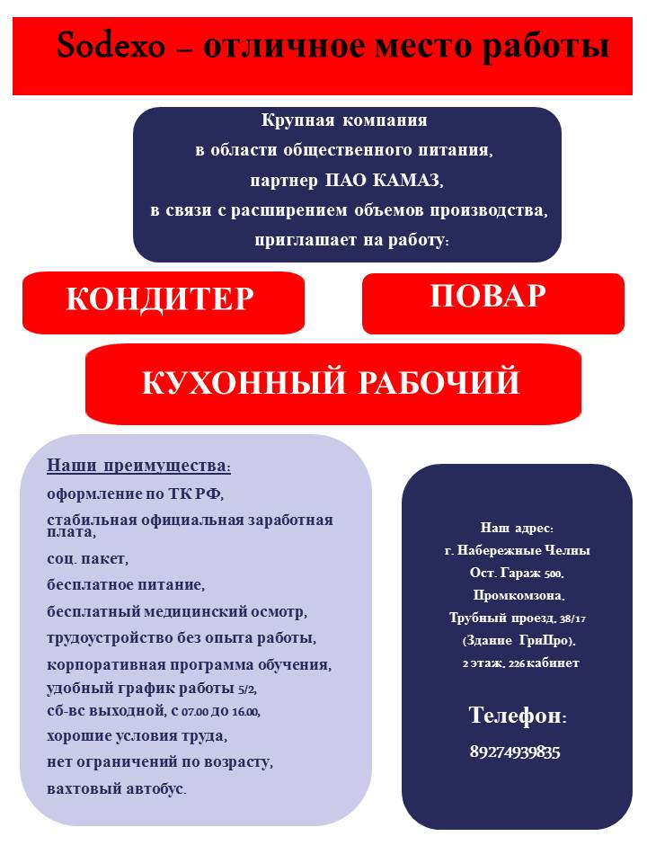 В этот день свои вакансии предложит ООО «Содексо-ЕвроАзия» - крупная компания в области общественного питания, партнер ПАО КАМАЗ.