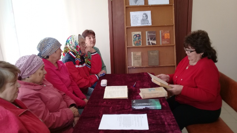 Библиотекарь познакомила читателей с биографией и творчеством писателя, рассказала о книгах, выставленных для просмотра. Читатели прочитали отрывок из повести “Девушки-звёздочки” о девушках героях - лётчиках, сражавшихся с врагом в небе, совершивших героические подвиги: Магубе Сыртлановой, Ольге Санфировой и других. Отрывок из книги “Откуда ты, Жан?”, прочитанный Тазовой Р.А. о парне Иване Кабушкине, работнике Казанского трамвайного депо, герое Советского Союза, совершившем героические подвиги в Великой Отечественной войне, тронул читателей до слез. После мероприятия двое читателей взяли книги почитать.