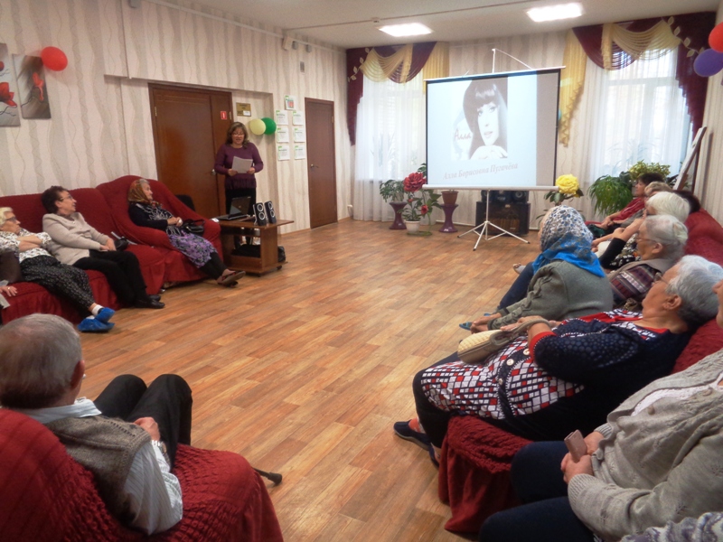 1 октября сотрудники Центральной библиотеки провели в Центре социальной помощи «Саулык» музыкальную программу «Так же как все», посвящённую творчеству одной из самых ярких звёзд российской эстрады - Аллы Пугачёвой.