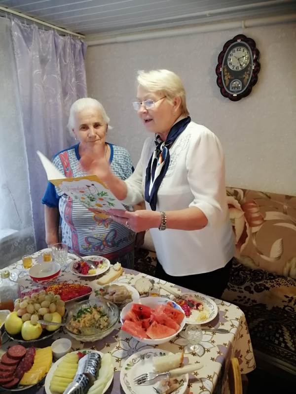 Библиотекарь Тихоновской сельской библиотеки Медведева Надежда Степановна вместе с главой сельского поселения Кармановым Алексеем Михайловичем навестили Александру Дмитриевну, поздравили с юбилеем и вручили подарок.