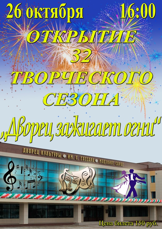 26 октября в 16.00 часов ждём менделеевцев вместе «зажечь огни» Дворца Культуры им. С. Гассара. Открытие 32 творческого сезона представит собой красочный и зажигательный праздник, на котором все коллективы Дворца культуры имени С. Гассара покажут зрителям яркую программу и продемонстрируют лучшие творческие номера. Концертная программа будет насыщенна новыми и яркими номерами. Творчество коллективов настолько разнообразно, что объединившись, они составят прекрасную радугу красок вокального, танцевального и театрального искусства! Перед зрителями выступят ансамбли танцев "Шаян" и "Кристалл", народный театр им. Ашрафа Ахунова, марийский вокальный ансамбль, "Эрвел", фольклорный ансамбль "Туганайлар", ансамбль татарской песни "Талларым", ансамбль удмуртской песни "Купанча", вокальная группа "Аккорд", детская вокально-эстрадная студия "Ля-Ля-Фа" и другие артисты.