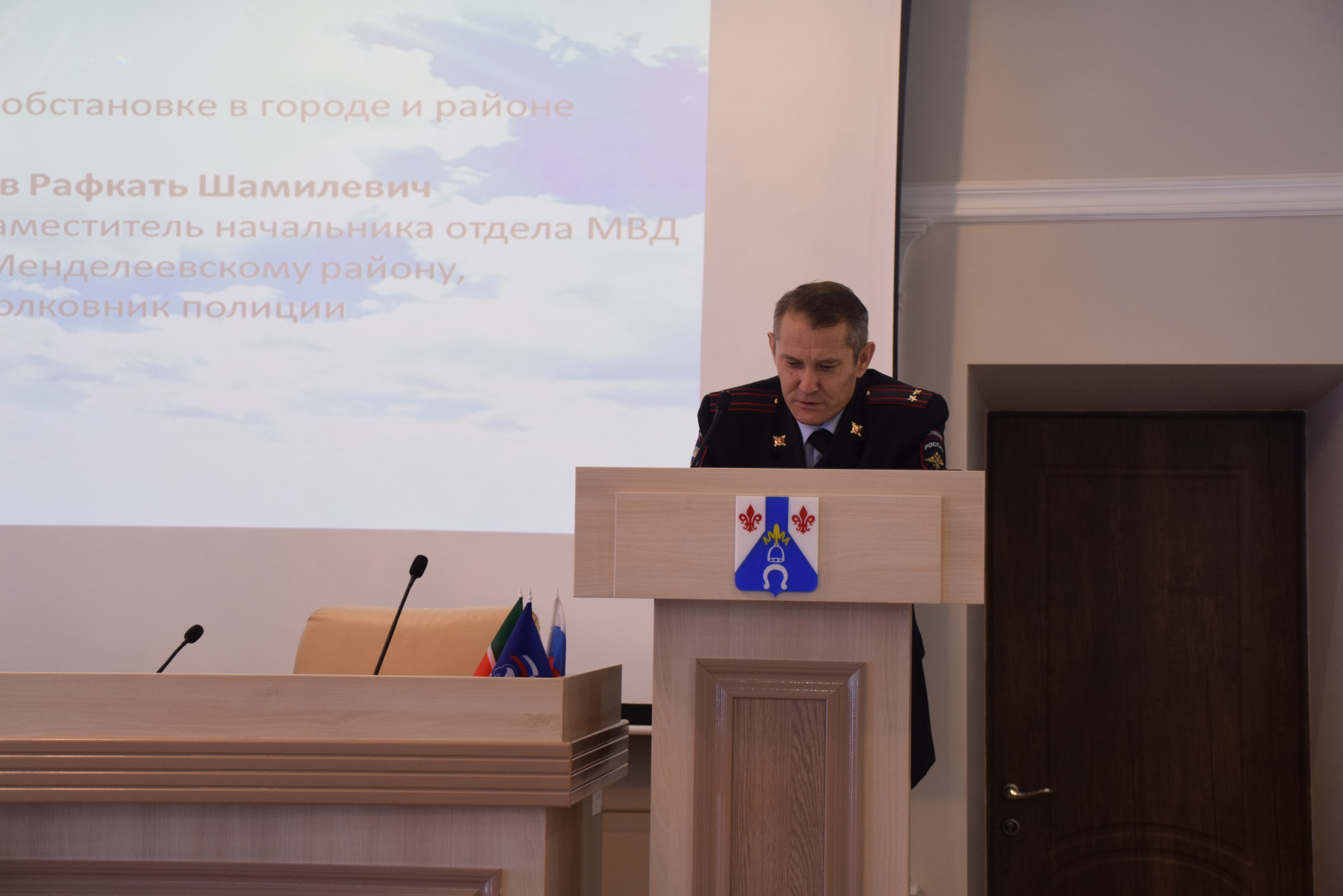 Об оперативной обстановке в городе и районе доложил Шамгунов Рафкать Шамильевич – начальник полиции, заместитель начальника отдела МВД России по Менделеевскому району, подполковник полиции.