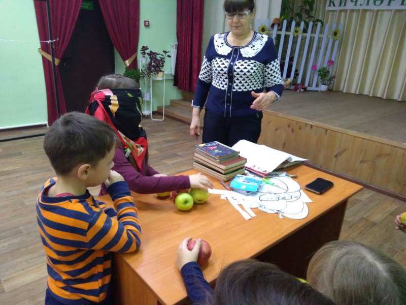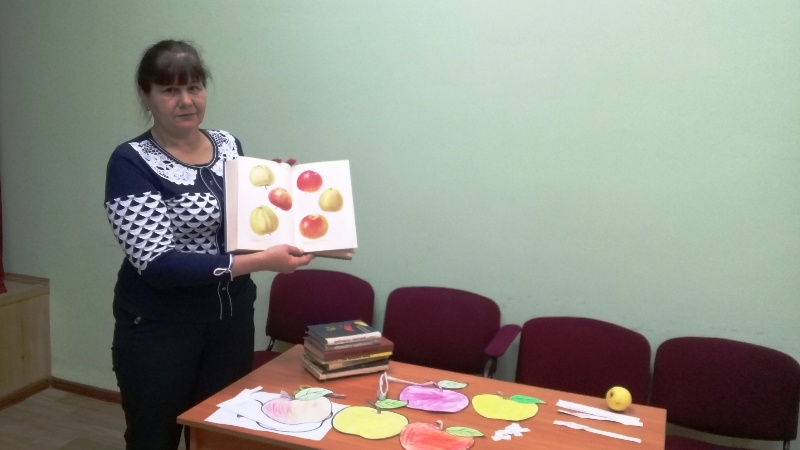 Она ознакомила читателей с книгами о выращивании, сортах яблок и журналами с кулинарными рецептами о выпечке из яблок. Участники мероприятия поиграли в игры: Ёжик и яблоко”, “Как растёт яблоня”, отрезали яблоки с завязанными глазами. В ходе мероприятия обогатили свой словарный запас пословицами о яблоках, выяснили смысл фразеологизмов о яблоках, по книге “Русские народные сказки” из разных сказок прочитали отрывки, где написано о яблоках, поговорили о полезных свойствах этого фрукта.