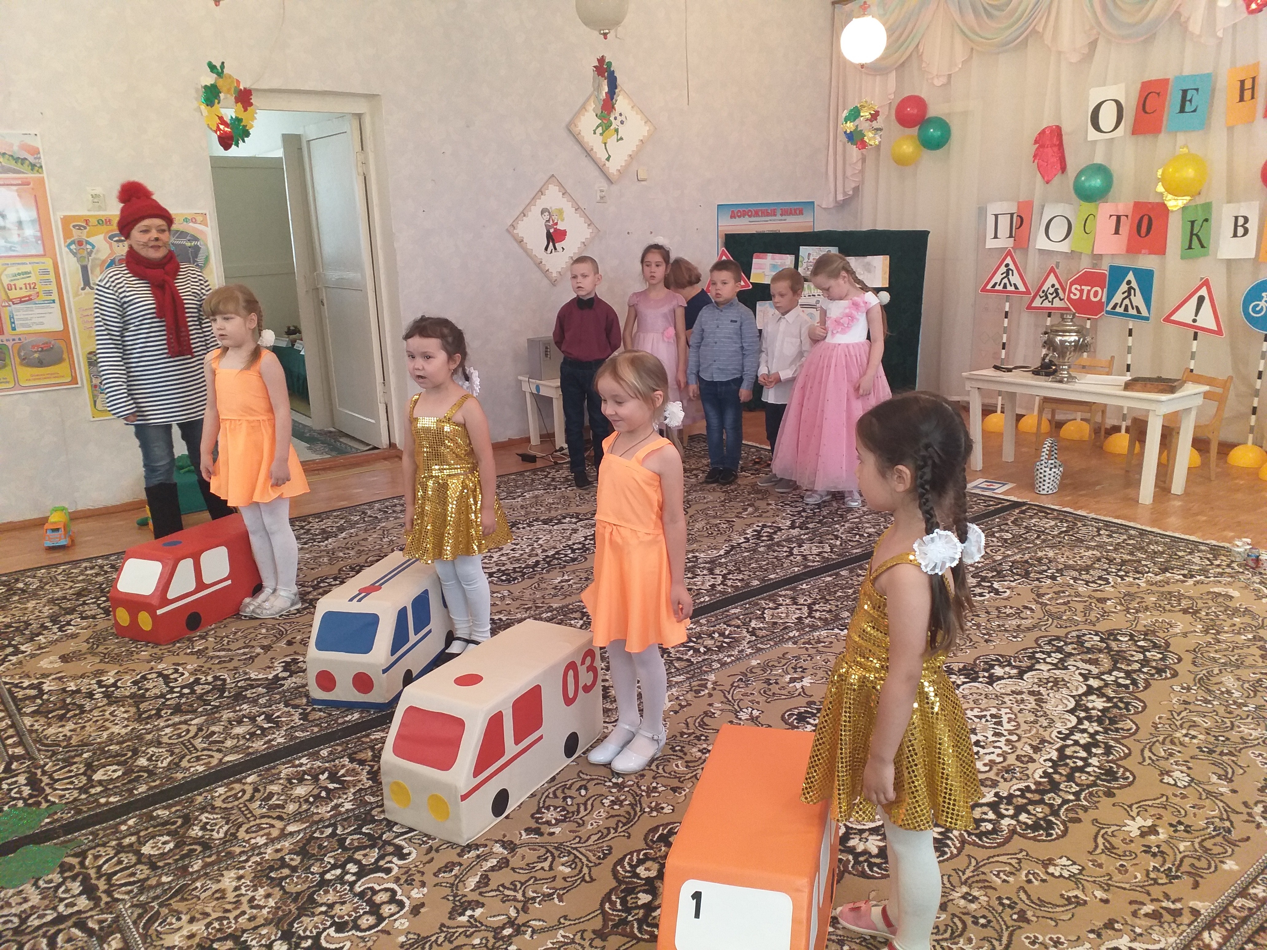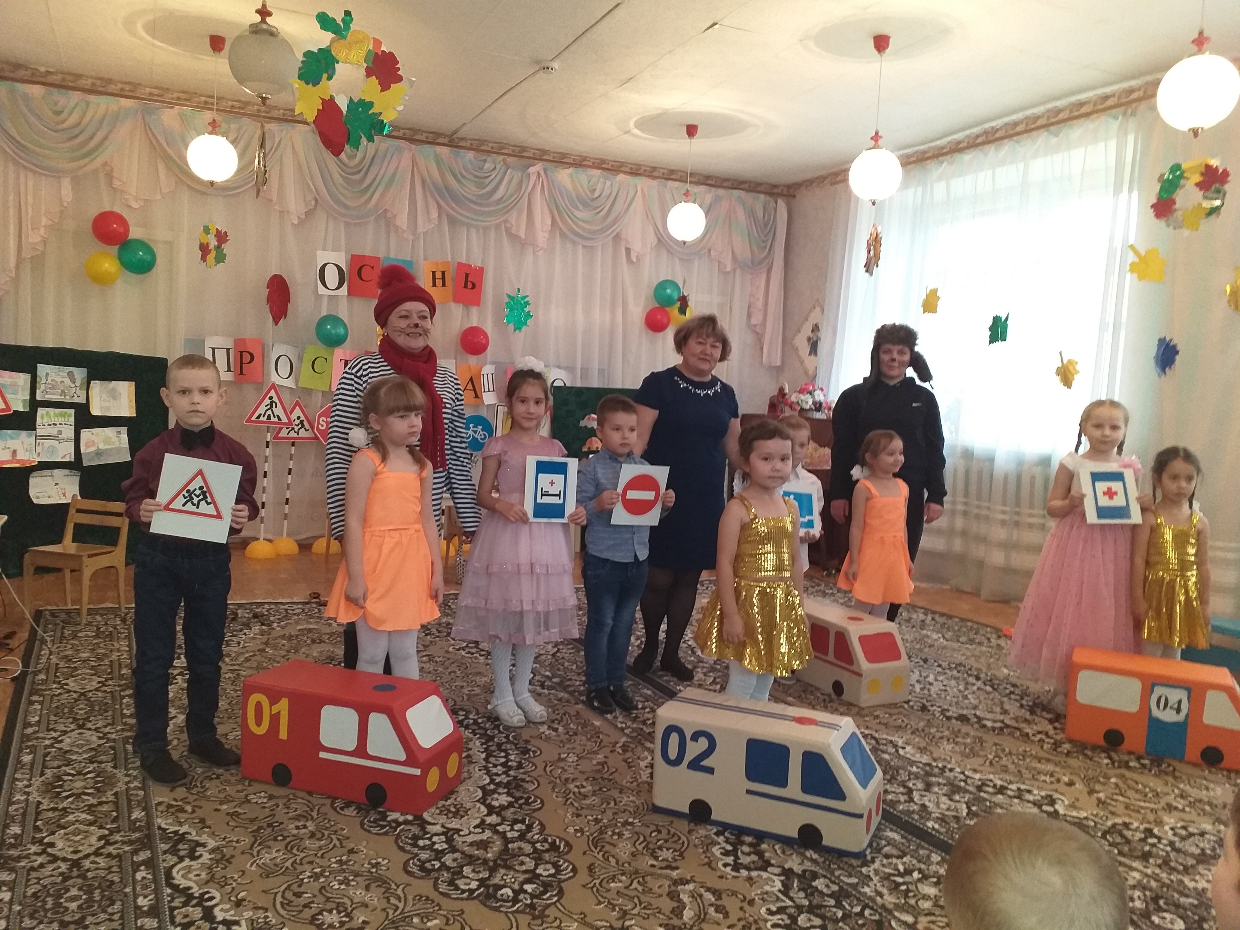 Мероприятие соеденило две темы осень и безопасное поведение на дороге и применение световозврапщаюшихся предметов в темное время суток. В деревню Простоквашино к коту Матросскину и собаке Шарику пришли дети и в игровой форме показали и рассказали о правилах поведения на дороге. Было много песен и стихов по теме. Дети рассказали о дорожных знаках в танце, собрали осенний урожай по цветам светофора и рассказали о правилах светофора. Во время танца в стихах рассказали о спец.автомобилях. Рассказали зачем и где применяются световозвращающиеся предметы. Воспитатели показали поделки которые дети сделали вместе с родителями дома. Утренник прошел весело и познавательно.