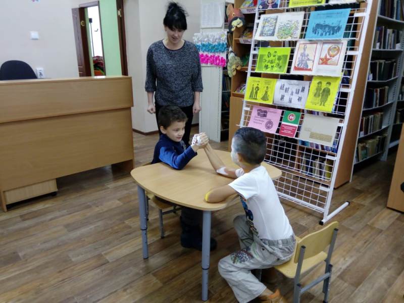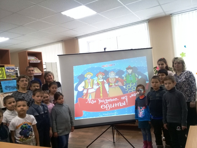 Вместе с библиотекарем ребята совершили исторический экскурс в 17 век: узнали о храбрых героях земли русской о полководце князе Дмитрии Пожарском и купце Кузьме Минине. Затем ребята совершили путешествие по просторам нашей страны: побывали на севере, где поиграли в бурятскую игру «Ухвати змею за хвост»; в Армении – станцевали армянский танец; затем вернулись в Россию. А наша страна славиться богатырями бесстрашными. Ребята с удовольствием померились своими силами «богатырскими» в играх «Армрестлинг», «Вытолкни соперника из круга». В конце мероприятия был проведен флешмоб «Я, ты, он, она – вместе дружная семья».
