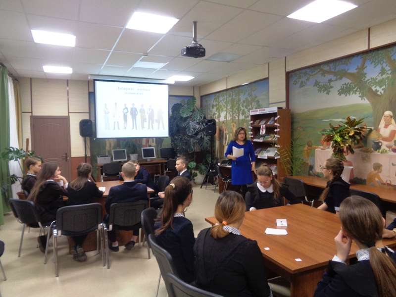 15 ноября в рамках года рабочих профессий сотрудники Центральной библиотеки провели для учащихся 8 класса шк. №1 деловую игру по профориентации «Лабиринты выбора».